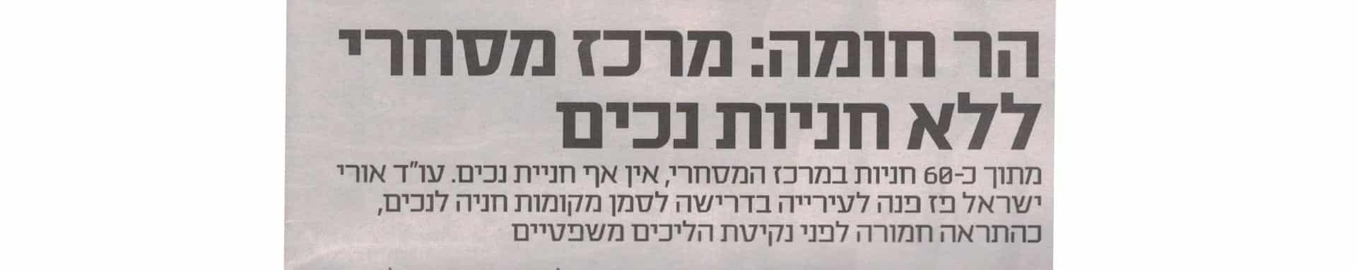 כל העיר ירושלים, חדשות מצב העיר 01.06.2018הר חומה: מרכז מסחרי ללא חניות נכיםליאת בכרך | כל העיר ירושלים | פורסם 01/06/18 10:30לחצו לקריאת הכתבה בעיתון כל העיר ירושלים » פרסומים בתקשורת » כל העיר ירושלים